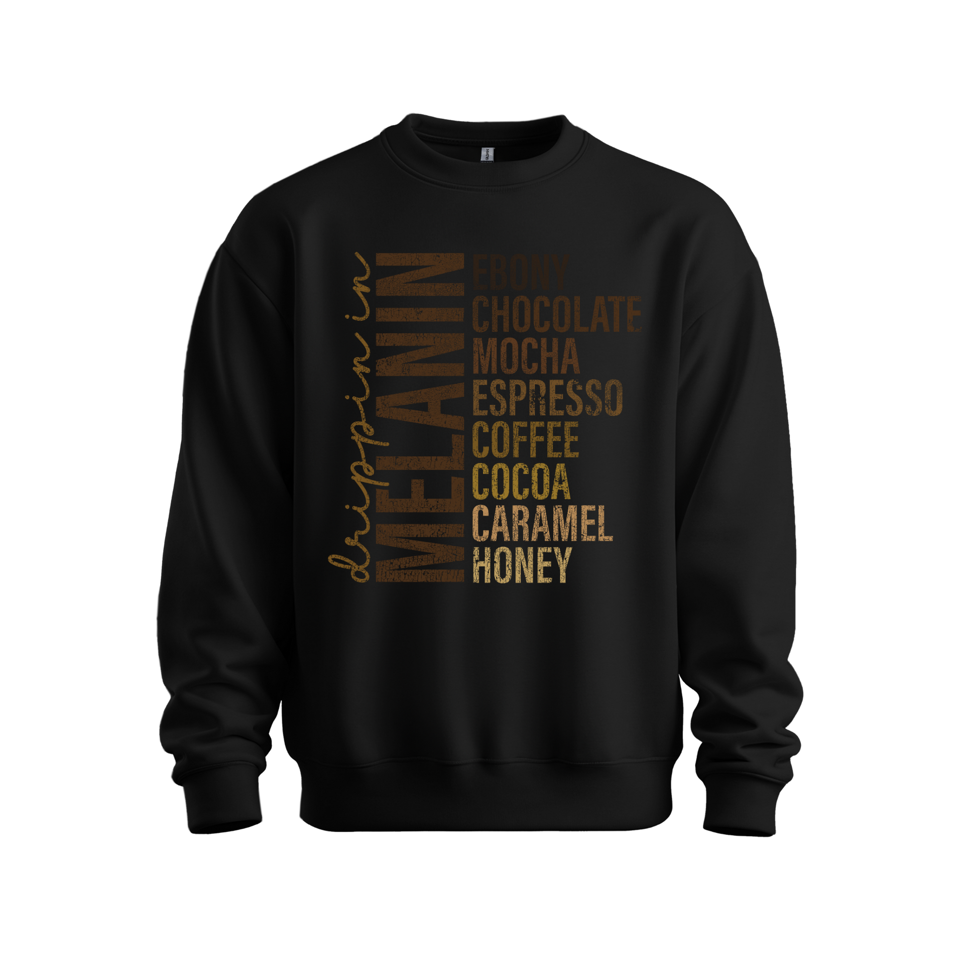 Celebrate the beauty, richness, and diversity of melanin with our Drippin’ in Melanin design. Featuring layered typography inspired by deep, warm tones (Ebony, Chocolate, Mocha, Espresso, Coffee, Cocoa, Caramel, and Honey) this piece is a bold yet elegant expression of pride and self-love.